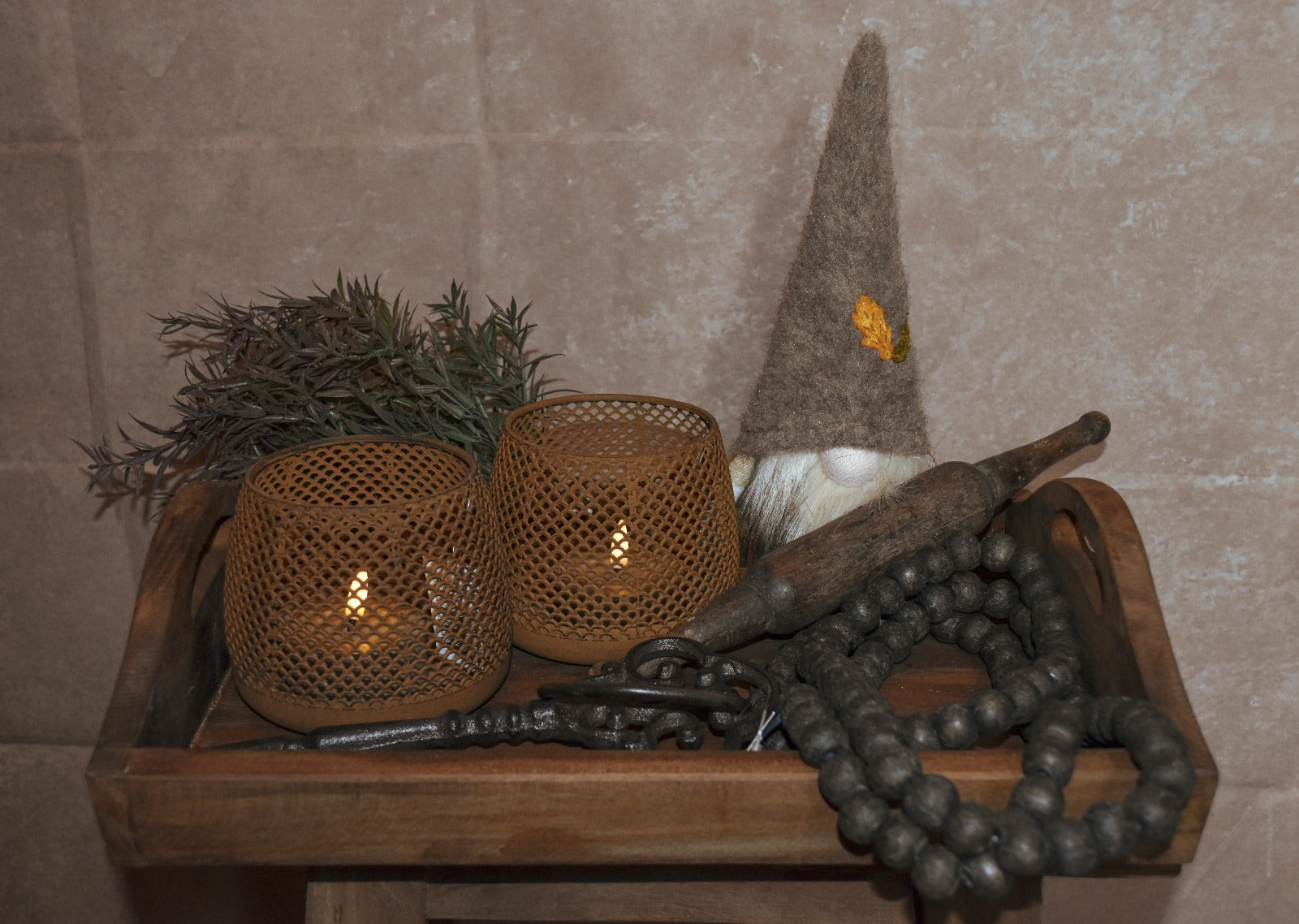 Warme houten tray gevuld met sfeervolle accessoires. Twee metalen windlichten met fijn opengewerkt patroon zorgen voor een zacht en gezellig licht.